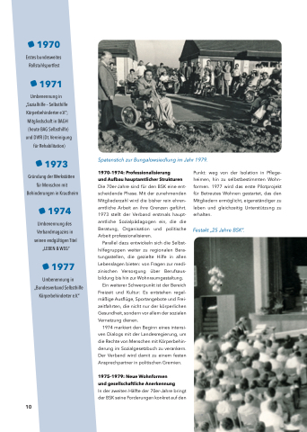 1974 markiert den Beginn eines intensi- ven Dialogs mit der Landesregierung, um die Rechte von Menschen mit Körperbehin- derung im Sozialgesetzbuch zu verankern. Der Verband wird damit zu einem festen Ansprechpartner in politischen Gremien.