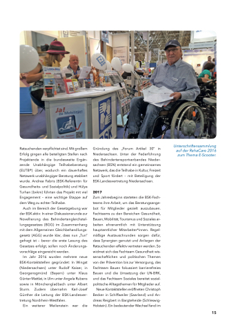Zum Jahresbeginn starteten die BSK-Fach- teams ihre Arbeit, um das Beratungsange- bot für Mitglieder gezielt auszubauen. Fachteams zu den Bereichen Gesundheit, Bauen, Mobilität, Tourismus und Soziales ar- beiten ehrenamtlich mit Unterstützung hauptamtlicher Mitarbeiter*innen. Regel- mäßige Austauschrunden sorgen dafür, dass Synergien genutzt und Anliegen der Ratsuchenden effektiv vertreten werden. So widmet sich das Fachteam Gesundheit wis- senschaftlichen und politischen Themen von der Prävention bis zur Versorgung, das Fachteam Bauen fokussiert barrierefreies Bauen und die Umsetzung der UN-BRK, und das Fachteam Soziales bereitet sozial- politische Alltagsthemen für Mitglieder auf.