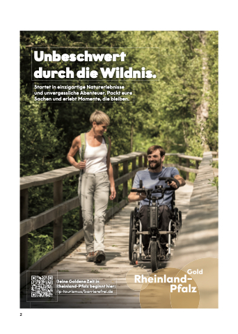 Unbeschwert durch die Wildnis. Startet in einzigartige Naturerlebnisse und unvergessliche Abenteuer. Packt eure Sachen und erlebt Momente, die bleiben. Deine Goldene Zeit in Rheinland-Pfalz beginnt hier: rlp-tourismus/barrierefrei.de 2