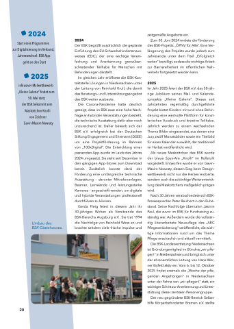 Im Jahr 2025 feiert der BSK e.V. das 50-jäh- rige Jubiläum seines Mal- und Kalende- rprojekts „Kleine Galerie“. Dieses seit Jahrzehnten regelmäßig durchgeführte Projekt bietet Kindern mit und ohne Behin- derung eine wertvolle Plattform für künst- lerischen Ausdruck und kreative Teilhabe. Jährlich werden zu einem wechselnden Thema Bilder eingesendet, aus denen eine Jury zwölf Monatsbilder sowie ein Titelbild für einen Kalender auswählt, der traditionell im Herbst veröffentlicht wird.