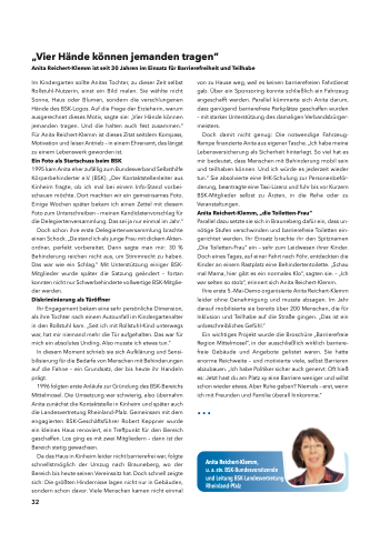 Im Kindergarten sollte Anitas Tochter, zu dieser Zeit selbst Rollstuhl-Nutzerin, einst ein Bild malen. Sie wählte nicht Sonne, Haus oder Blumen, sondern die verschlungenen Hände des BSK-Logos. Auf die Frage der Erzieherin, warum ausgerechnet dieses Motiv, sagte sie: „Vier Hände können jemanden tragen. Und die halten auch fest zusammen.“ Für Anita Reichert-Klemm ist dieses Zitat seitdem Kompass, Motivation und leiser Antrieb – in einem Ehrenamt, das längst zu einem Lebenswerk geworden ist.