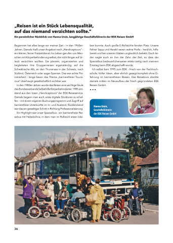 Ich selbst kam 1995 zum BSK – frisch von der Fachhoch- schule. Voller Ideen, aber ehrlich gesagt komplett ohne Er- fahrung im barrierefreien Reisen. Das Reisebüro steckte damals mitten im Neuaufbau der frisch gegründeten BSK Reisen GmbH.