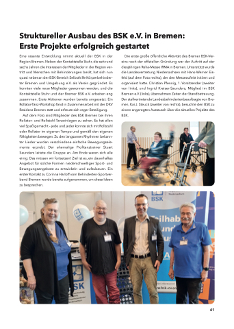 Eine rasante Entwicklung nimmt aktuell der BSK in der Region Bremen. Neben der Kontaktstelle Stuhr, die seit rund sechs Jahren die Interessen der Mitglieder in der Region ver- tritt und Menschen mit Behinderungen berät, hat sich nun quasi nebenan der BSK-Bereich Selbsthilfe Körperbehinder- ter Bremen und Umgebung e.V. als Verein gegründet. Es konnten viele neue Mitglieder gewonnen werden, und die Kontaktstelle Stuhr und der Bremer BSK e.V. arbeiten eng zusammen. Erste Aktionen wurden bereits umgesetzt: Ein Rollator-Tanz-Workshop fand in Zusammenarbeit mit der DKV Residenz Bremen statt und erfreute sich reger Beteiligung.