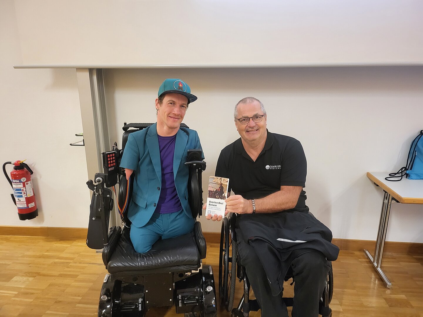 Janis wurde ohne Arme und Beine geboren und setzt sich mit großer Leidenschaft für Inklusion, Selbstbestimmung und das Überwinden von Grenzen ein. Janis Leitsatz lautet: „Es geht nicht darum, was nicht geht – sondern darum, wie man Dinge möglich machen kann.“ Bei dieser Gelegenheit konnte Rudi Bamberger ihm den neuen Flyer über barrierefreies Reisen überreichen, den er selbst entworfen habe.