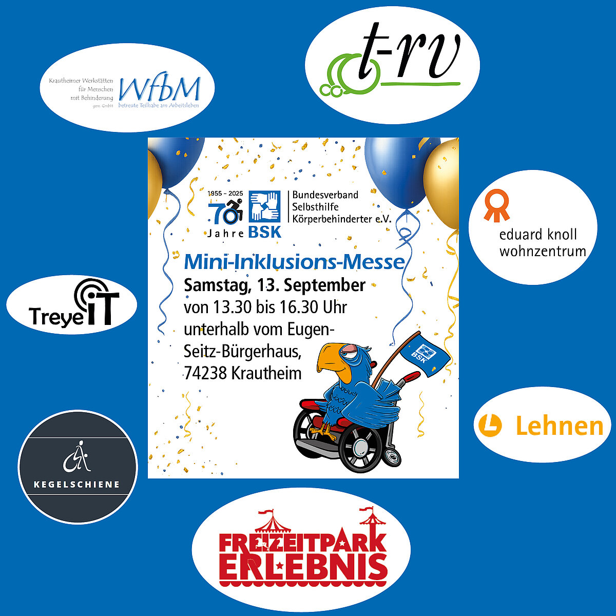 Am Samstag, 13. September 2025, feiert der Bundesverband Selbsthilfe Körperbehinderter e.V. (BSK) sein 70-jähriges Vereinsjubiläum. Anlässlich dieses Ereignisses findet im Rahmen der Feierlichkeiten eine Mini-Messe mit Hilfsmittel- und Inklusions-Angeboten statt.